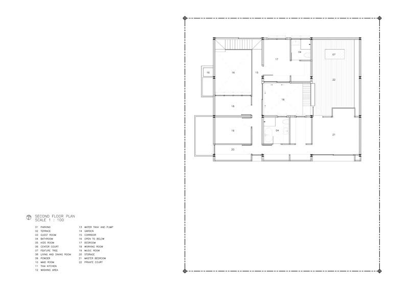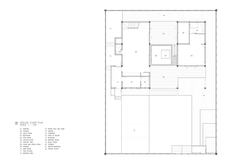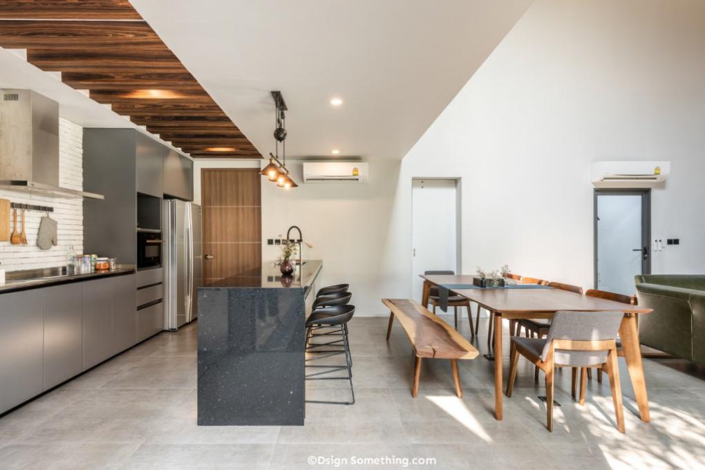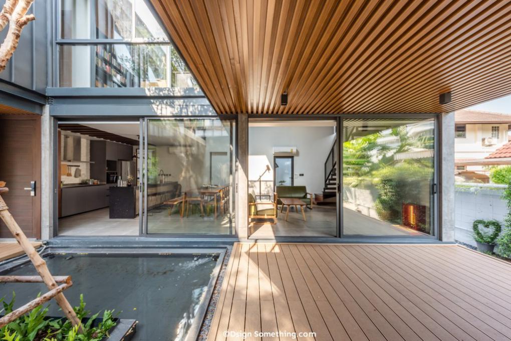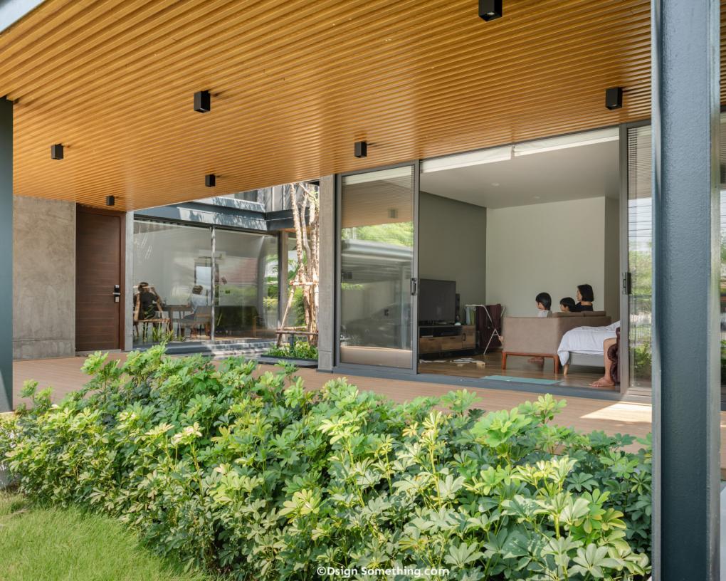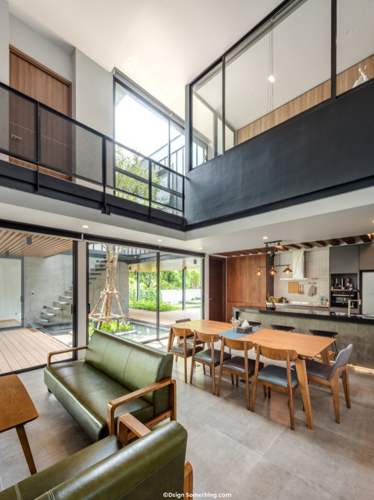 เมื่อเดินเข้ามาในบ้านจะพบกับต้นไม้และชานกลางบ้านก่อนเป็นอันกับแรก ซึ่งพื้นที่ส่วนนี้เป็นดั่ง Common Space ที่คนในครอบครัวมาใช้เวลาร่วมกัน ชานกลางบ้านทำหน้าที่เชื่อมต่อระหว่างส่วนเจ้าของบ้านและห้องนอนของคุณพ่อ คุณแม่ เมื่อเข้ามาในส่วนเจ้าของบ้านจะพบกับห้องโถงขนาดใหญ่ Double Ceiling เป็น Open Plan ประกอบด้วยห้องรับประทานอาหารและห้องนั่งเล่น จัดวางเฟอร์นิเจอร์แบบลอยตัว เพื่อสร้างความโปร่ง โล่ง และดูแลรักษาง่าย