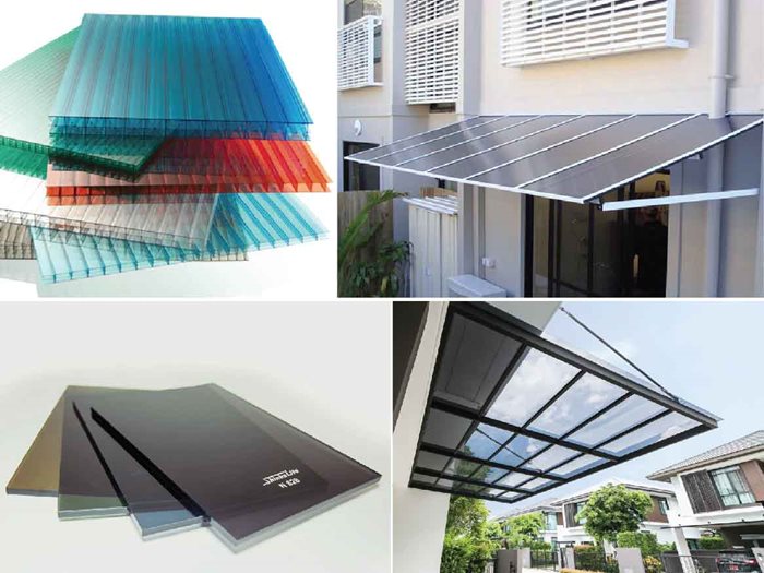 หลังคาแบบโปร่งแสงและทึบแสงมีวัสดุมุงหลายแบบหลายสีให้เลือก สำหรับหลังคาโปร่งแสงจะมีวัสดุแผ่นเรียบอย่างโพลีคาร์บอเนต (แบบแผ่นตัน แบบแผ่นลูกฟูก แบบผิวส้ม) และอะคริลิก (มีทั้งรุ่นธรรมดา รุ่นคุณภาพสูงเพิ่มความแข็งแกร่ง รุ่นป้องกันความร้อน) นอกจากนี้ยังมีไฟเบอร์กลาสทั้งแผ่นเรียบและแผ่นลอน กับอีกวัสดุคือ UPVC ซึ่งมีลักษณะเป็นแผ่นลอน (หากเป็นสีขาวขุ่นแสงจะส่องผ่านเพียง 40 %)
