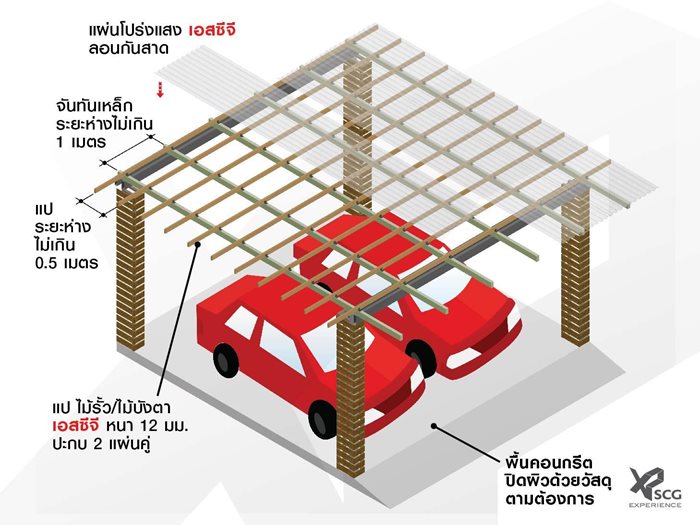 ทั้งนี้ เจ้าของบ้าน อาจเลือกรูปแบบการต่อเติมหลังคาโรงรถหน้าบ้าน ในลักษณะของระแนงไม้ ซึ่งดูสวยงามในรูปแบบที่ต่างกับหลังคาทั่วไป ทั้งยังช่วยกรองแสงและยังให้ลูกเล่นแสงเงา ในทิศทางต่างๆ ตามช่วงเวลาด้วย โดยปิดทับด้วยวัสดุใสเพื่อกันฝน อย่างแผ่นโปร่งแสงลอนกันสาด อะคริลิกแผ่นเรียบ หรือพลาสติกลูกฟูก เป็นต้น
