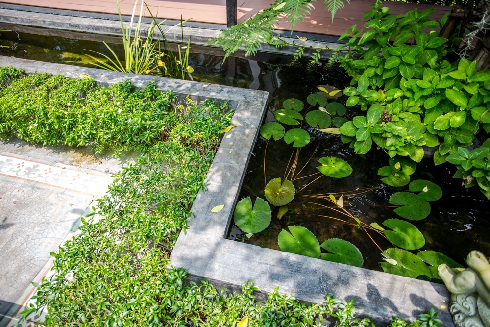 สร้างแหล่งน้ำบริเวณบ้าน เพิ่มความเย็นสบาย : รังสรรค์บรรยากาศแห่งความผ่อนคลายให้บ้านเย็นสบายตลอดวัน โดยการสร้างแหล่งน้ำใกล้ตัวบ้าน เช่น ขุดบ่อน้ำขนาดเล็ก วางอ่างบัว หรือทำอ่างน้ำล้น เมื่อน้ำกระทบกับความร้อนในตอนกลางวัน ก็จะระเหยกลายเป็นไอ ทำให้ลมพัดนำอากาศเย็นสบายเข้าสู่ตัวบ้าน