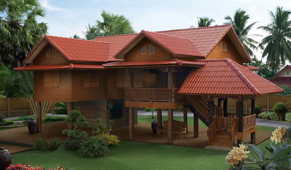 หลังคาทรงสูง : หนึ่งในภูมิปัญญาของไทยที่สามารถประยุกต์เข้ากับบ้านยุคใหม่ในเขตเมืองร้อน ซึ่งสามารถเลือกออกแบบได้ทั้งหลังคาทรงจั่ว ทรงปั้นหยา ทรงมะนิลา หรือทรงประยุกต์ หรืออาจผสานความทันสมัยให้บ้านดูโมเดิร์นมากยิ่งขึ้น ด้วยการลดทอนรายละเอียดให้ซับซ้อนน้อยลง โดยเลือกใช้กระเบื้องหลังคาแบบเรียบ และใช้โทนสีสมัยใหม่ที่แตกต่างไปจากเดิม เป็นต้น ด้วยรูปทรงของหลังคาที่มีองศาลาดชัน ซึ่งช่วยลดพื้นผิวสัมผัสในการรับความร้อนจากแสงอาทิตย์ และช่วยระบายน้ำฝนได้รวดเร็ว