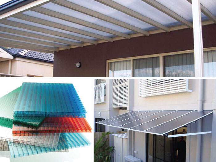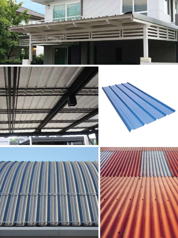 หลังคาโพลีคาร์บอเนต หลังคาวัสดุพลาสติกที่มีทั้งโปร่งใส โปร่งแสง ทึบแสง มีรูปลอนหลากหลาย และมีเฉดสีให้เลือกค่อนข้างมาก ความหนาวัสดุอยู่ที่ 0.8 - 1.5 มม.