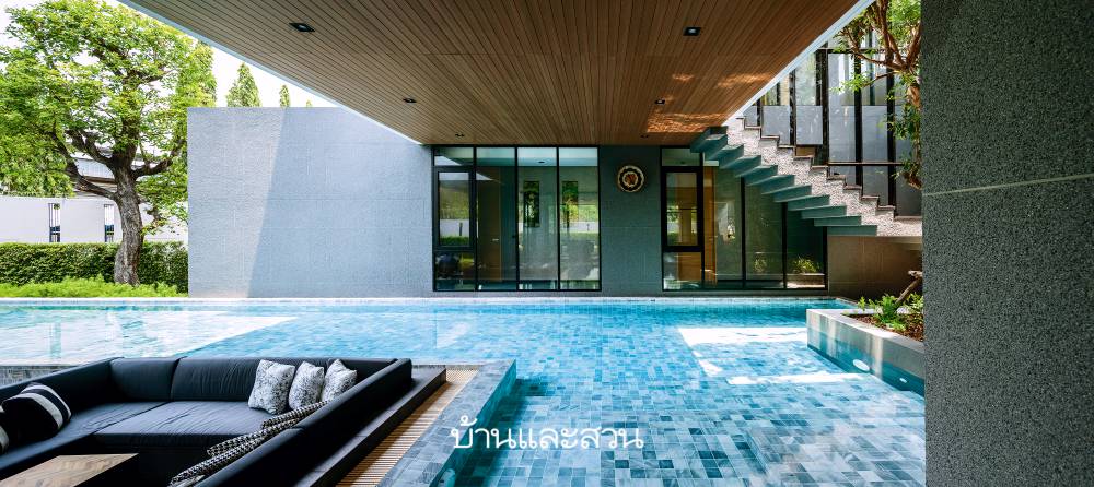 ทางแรกเป็นทางหลักที่ขับรถผ่านกลุ่มโรงงานเข้ามาด้านหน้าบ้าน อีกทางเดินข้ามคลองจากโรงงานมาด้านหลังบ้าน และเพื่อให้เส้นทางเดินกลางบ้านนี้สวยงามไม่ว่าจะเข้าจากทางไหน ผมจึงทำให้เป็นพื้นที่กึ่งกลางแจ้งที่มีแลนด์สเคปเลื้อยเข้ามาในบ้าน เชื่อมต่อด้วยสระว่ายน้ำ และแก้ปัญหาเรื่องกลิ่นหรือเสียงจากโรงงานด้านข้างด้วยการวางผังส่วนห้องนอน ห้องเก็บของ และส่วนเซอร์วิสไปขวางไว้เพราะไม่ใช่พื้นที่ใช้งานในช่วงกลางวัน แต่ให้ความสำคัญกับพื้นที่ส่วนกลางซึ่งทุกคนใช้ในช่วงกลางวันมากที่สุด เมื่อลำดับความสำคัญตามนี้ทำให้เกิดฟังก์ชันและหน้าตาของบ้านตามมา