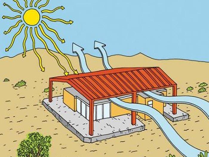 ความร้อนมาจากทุกทิศทางหากมาจากด้านข้างเรายังพอหาวิธีกรองแสงแดดให้บางเบาได้ แต่หากมาจากด้านบนหรือหลังคา หลังคานั้นก็มีคุณสมบัติที่สามารถกันและระบายความร้อนได้ดี