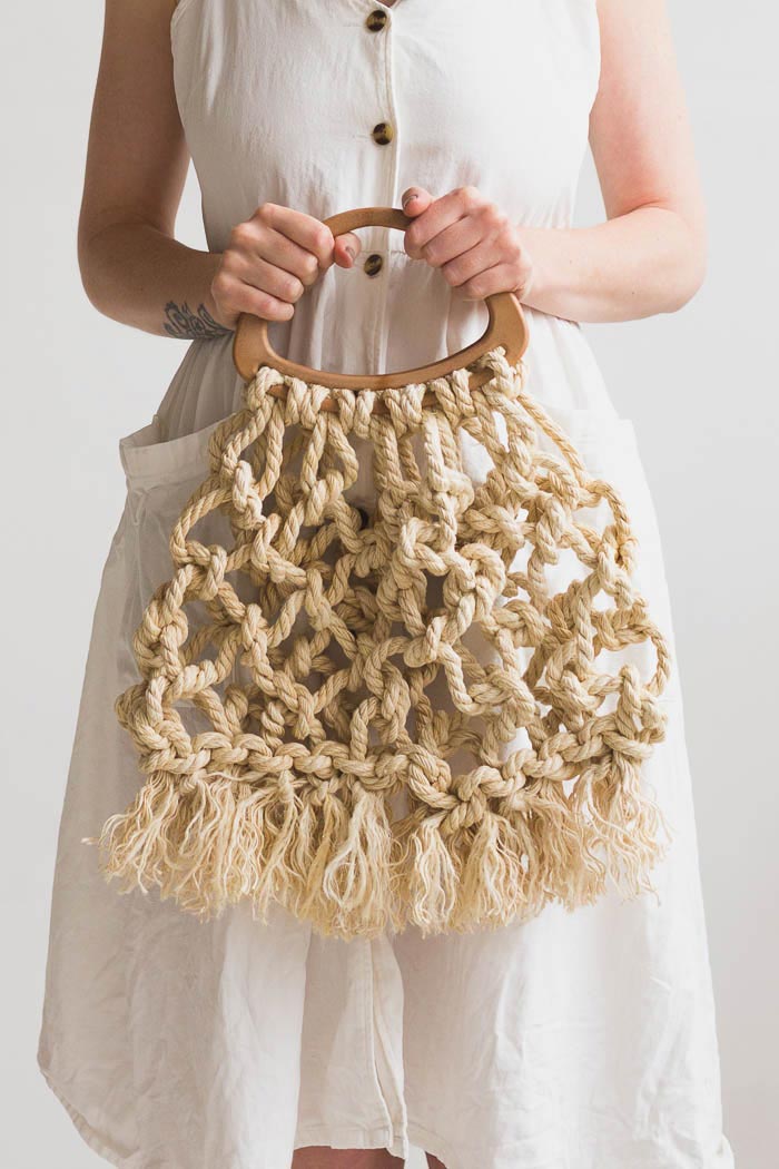 แค่มีหูกระเป๋าสำเร็จรูปกับเชือกก็สามารถทำกระเป๋าเก๋ ๆ ไว้ใช้เองได้ง่าย ๆ แล้ว โดยวิธีการก็คือ