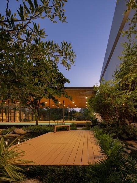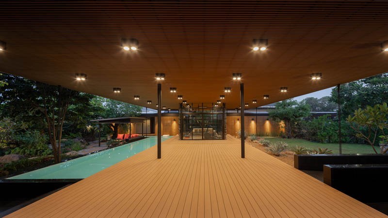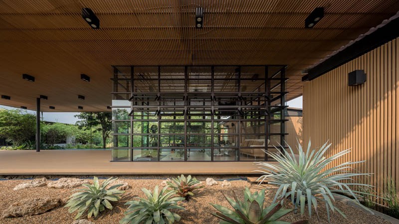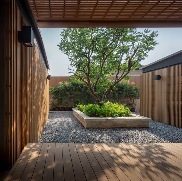 ซึ่งการเลือกใช้ระแนงไม้แทนการใช้ผนังปิดทึบทุกส่วน ก็เพื่อสร้างความเป็นส่วนตัว แต่ในขณะเดียวกันก็ยังมีความโปร่ง โล่ง เปิดรับมุมมองจากภายนอก มีลมพัดผ่านนั่นเอง และทางผู้ออกแบบยังนำประโยชน์จากระแนงไม้และสวนรอบข้างกั้นความเป็นส่วนตัวจากผู้คนภายนอก แต่ในทางกลับกันก็มีคอร์ทกลางบ้าน เพื่อเปิดรับทิวทัศน์จากภายใน มากไปกว่านั้นแสงธรรมชาติที่สาดส่องผ่านระแนงไม้ ยังทำให้เกิด Transition Space เล็กๆ ระหว่างสวนและ Sport Pavilion อีกด้วย