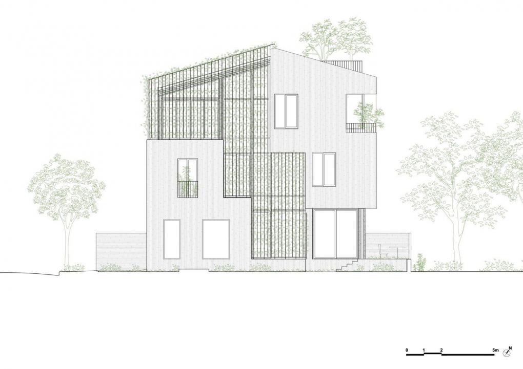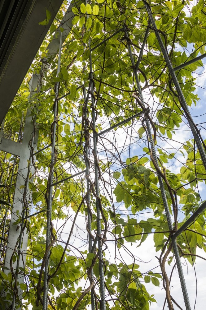 เปลือกของอาคารชั้นนอกถูกปกคลุมไปด้วยไม้เลื้อย ส่วนชั้นในมีหน้าต่างบานเลื่อนที่เลือกเปิดให้อากาศถ่ายเท หรือเลือกปิดเพื่อความเป็นส่วนตัวได้ ซึ่งเมื่อลมพัดผ่านเข้ามาจะช่วยให้อากาศภายในบ้านเย็นขึ้น นอกจากนี้ผนังในส่วนห้องนอนและห้องน้ำในส่วนที่เป็นช่องเปิดหน้าต่าง จะมีการย่นระยะเข้ามา เพื่อเว้นระยะให้สามารถสอดแทรกพื้นที่สีเขียวภายนอกได้ โดยสถาปนิกตั้งใจให้ต้นไม้เป็นม่าน ที่ช่วยเรื่องความเป็นส่วนตัวจากมุมมองภายนอก พร้อมทั้งแบ่งปันพื้นที่สีเขียวสู่ภายในบ้านและบริบทไปพร้อมๆกัน